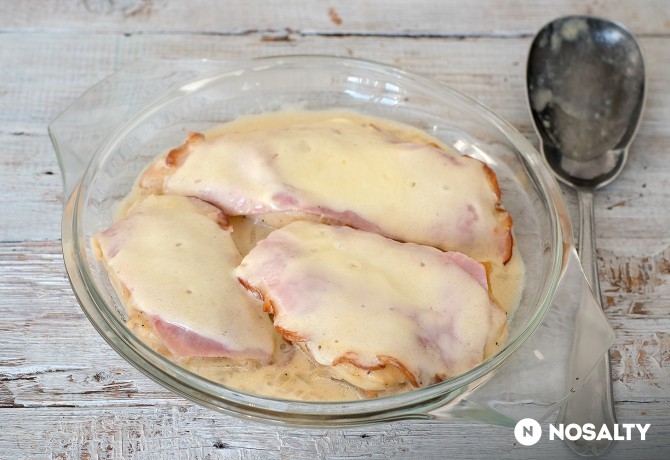 - Hozzáöntjük a tejszínt, elkeverjük benne, és visszatesszük a hússzeleteket. Minden húsra egy-egy sonkát és sajtot fektetünk, majd lefedjük, és további 5-6 percig fedő alatt főzzük, amíg a szaft besűrűsödik és a sajt megolvad.