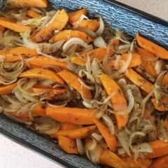 - Közben a sütőt előmelegítjük (alul-felül sütés) 200 fokra, és előveszünk egy nagyobb tepsit. 3 kanál kókuszzsírt eloszlatunk a tepsiben. Ezután beletesszük az édesburgonyacsíkokat, majd a hagymákat.
