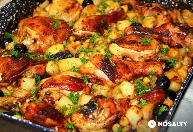 - Mikor kb. félpuhára sültek, hozzáadjuk a hagymákat karikára vágva, a felaprított fokhagymát és a burgonyát. Jól átforgatjuk a csirke zsírjában őket, öntünk alá kb. 100 ml forrásban lévő vizet, kissé megsózzuk, borsozzuk újból. Visszatesszük a sütőbe, és kb. 30 perc alatt szinte puhára sütjük.